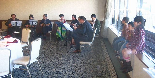 | 今年のファミリーコンサートは例年になく多くの人に参加して頂きました メンバー8名、ゲストやそのファミリーが16名の総勢24名 ・・・ なかでもチビッ子3名の参加で会場はいっそう盛上がりました |